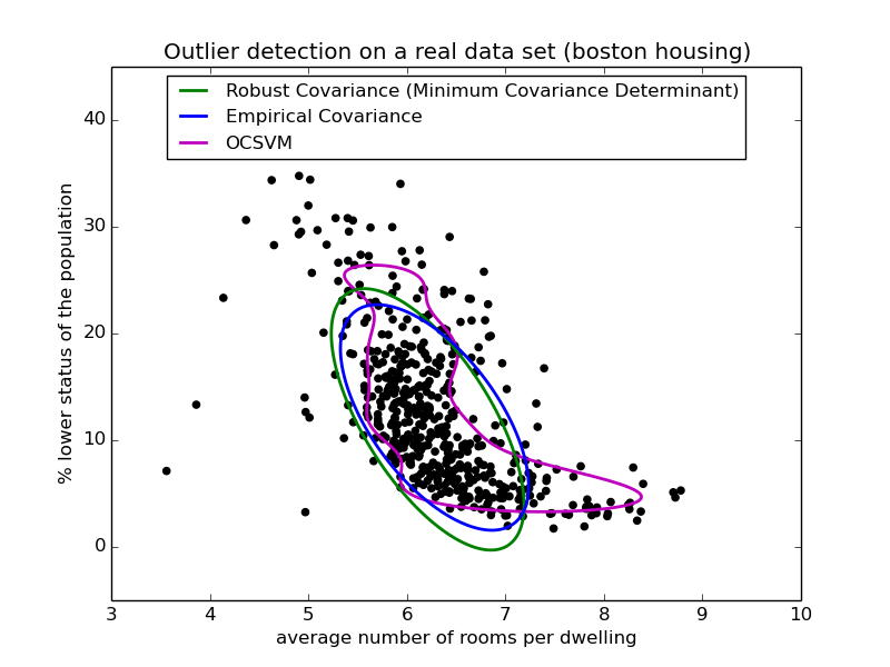 We selected two sets of two variables from the boston housing data set as an illustration of what kind of analysis can be done with several outlier detection tools. For the purpose of vizualisation, we are working with two-dimensional examples, but one should be aware that things are not so trivial in high-dimension, as it will be pointed out.