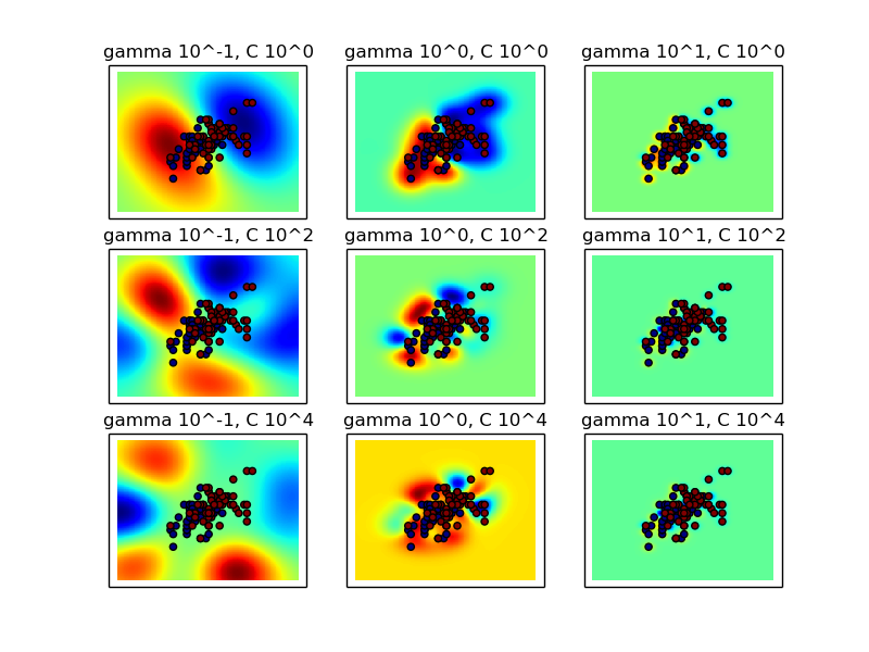 This example illustrates the effect of the parameters gamma and C of the rbf kernel SVM.